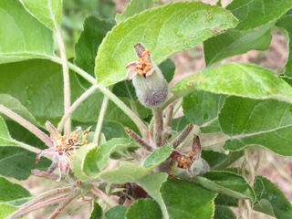 5個出来ていた幼果は、摘花されて美味しいりんごになるための1個が残されています。