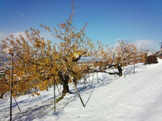 畑の紅葉したりんごの葉っぱも雪の白に映えてとてもキレイです!