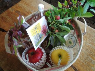 (りんごジュースのビン・パック、りんご「さんさ」「きおう」「つがる」、青しそのソース、りんごの缶詰、ポストカード、クラブアップルの枝を飾って)