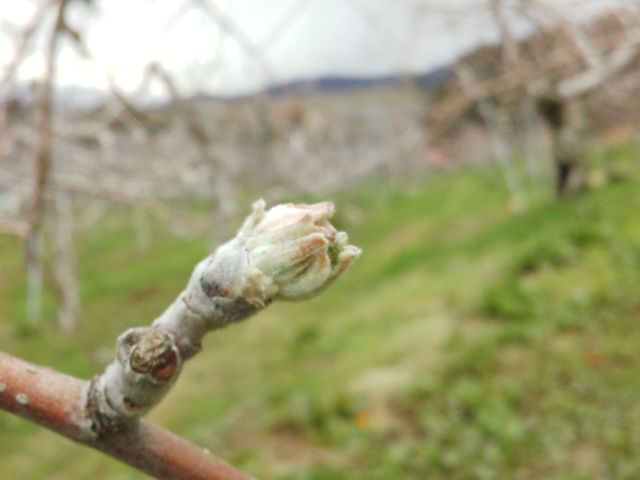 りんごのつぼみは、気温の低い年は身をギュッと寄せ合って、寒さに耐える品種があるのだそうです。