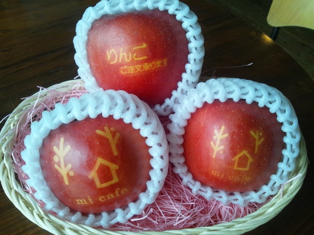 絵文字入りりんごは、お隣の畑の「ふじむら農園」さんの作品。