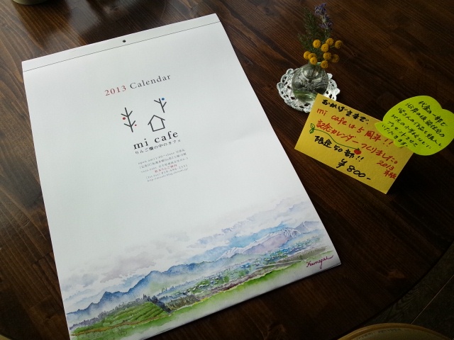 カレンダーの絵は、お店のお客様で、mi cafeの景色を描いてくださる盛岡市在住の熊谷淳さんの作品です。