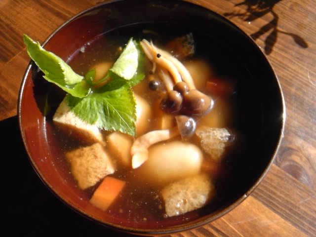 根菜やしめじや凍み豆腐、具沢山の醤油味の汁の中に、まめぶが入っています。