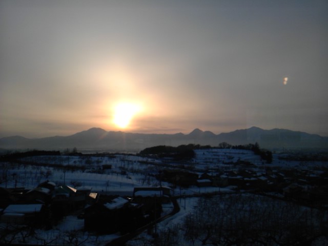 今は雲が低くかかって、雪もはらはら落ちてきました。